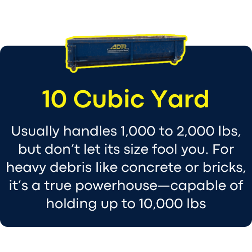 | 10 Yard | 1-2 tons | Small cleanouts, light remodels | Small furniture, household junk, drywall scraps, yard waste |
