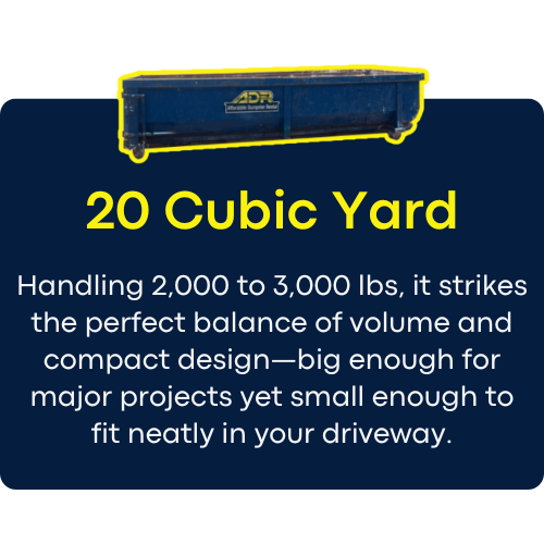 | 20 Yard | 2–3 Tons | Home remodels, roofing, mid-size cleanouts | Sofas, mattresses, drywall, flooring, cabinets, shingles |