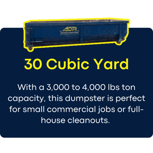 | 30 Yard | 3–4 Tons | Estate cleanouts, large projects | Large furniture, appliances, lumber, plaster, insulation |