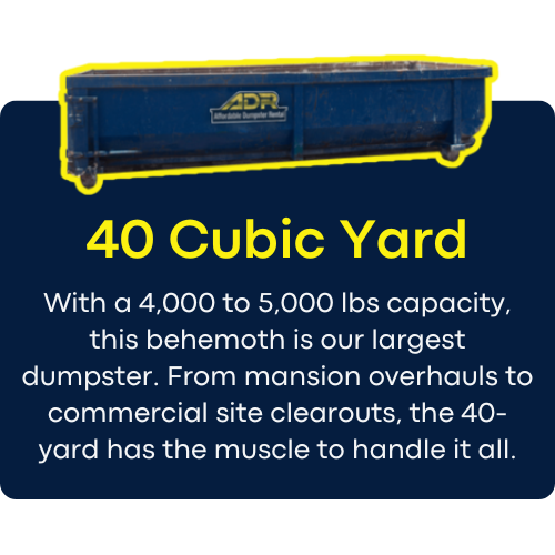 | 40 Yard | 4–5 Tons | Major renovations, commercial jobs | Demolition debris, siding, windows, office furniture, warehouse junk |